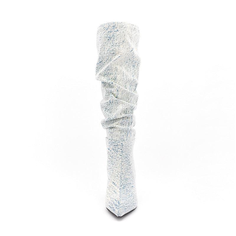 White Denim High Heel Tall Boots